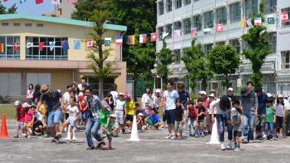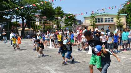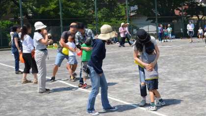 「二人三脚風船割り競走」子どもと子ども、子どもと大人が二人三脚で走り、途中で風船を2人の体でわります。風船がなかなかわれなくて・・・