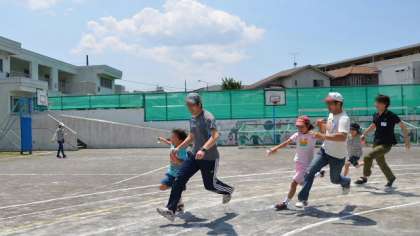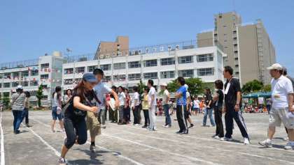 「借り人競走」子どもたちが途中の札に書いてある人を探して一緒に走ります。