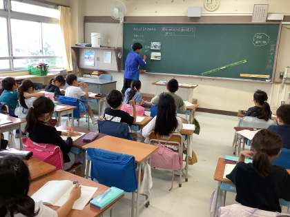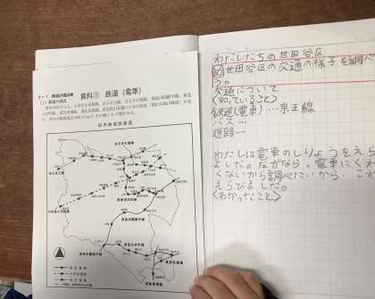 今日は、世田谷区の交通を調べました。写真や路線図を見て、北側に駅やバス停が集まっていることや道路が多いことに気付き、交通の様子をみんなでまとめていきました。