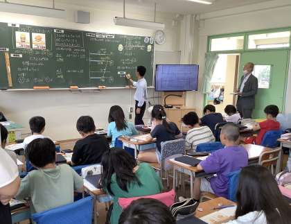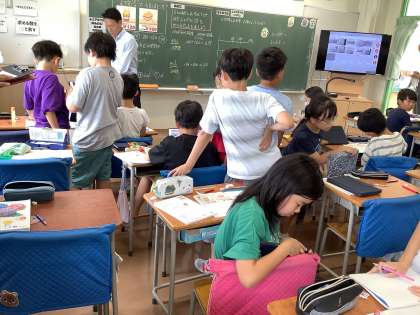 今日は、値下げされたポテトやナゲットの値段を見て、よりお買い得になっているのはどちらか考えました。数直線を使って、もとの値段の何倍になっているかで比べていきました。