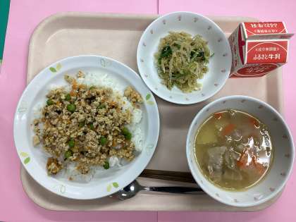 凍り豆腐入りそぼろごはん 野菜のごまだれかけ みそけんちん 牛乳