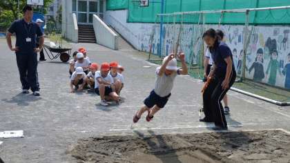 幸い午前中の早い時間帯はあまり風もなく涼しく、天候にも恵まれました。校庭では「ソフトボール投げ」と「立ち幅跳び」をしました。直径2mの円から出ないように投げ、ボールも左右30度の中に落ちるようにするのが、けっこう難しいようでした。