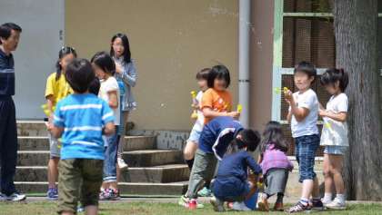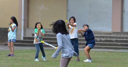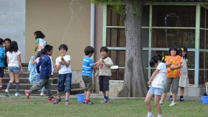 29日2時間目。4年生が理科の「空気と水」の学習で、水でっぽうで遊びました。遊んだといっても学習の一環です。今の理科では、知識だけでなく体験も重視します。強く押したときや弱く押したときの感覚を大事にして、どうしてそうなるのかを考える材料にするわけです。日差しが強く暑いくらいでしたので、子どもたちは喜んで水を飛ばしていました。うれしそうでしょう。