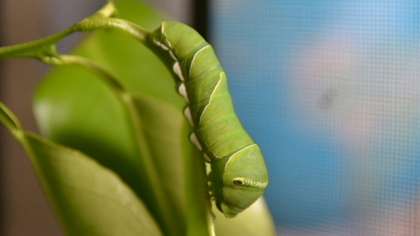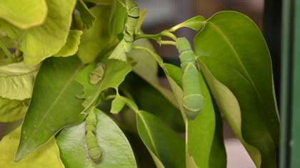 校長室で飼っているアゲハの幼虫です。先日お知らせした5令の幼虫が体長5センチメートルほどになりました。もうすぐサナギになりそうです。他にもここ数日で3匹が緑色の5令に大変身。