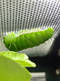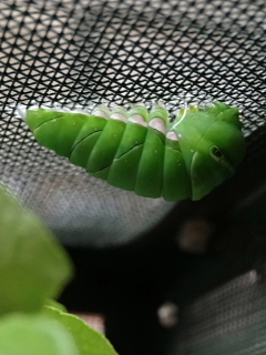 飼育しているアゲハの幼虫がもうすぐサナギに成りそうです。食草からはなれ、手近なサナギになってぶら下がりやすいところに移動して、口から糸をはいてしっかりくっつき、ようすも少しずつ変わっています。
