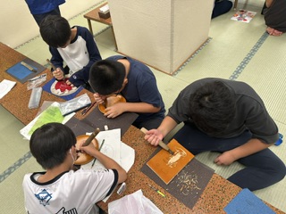 本日最後の行程は、日光伝統の日光彫りです。初めてのひっかき刀を使うのに苦戦しながらも、徐々にコツをつかみ、オリジナルの作品が出来上がりました。早く使うのが楽しみなようです。