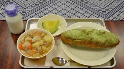 写真は、6月5日の給食です。パンの名前は「ケロケロあげパン」といいます。揚げパンに抹茶がかかっているのでしょうか? いいえ、実はいつも揚げパンに使っているきなこの代わりに、「青大豆」という大豆を使った緑色のきなこがかかっています。6月は梅雨の季節。梅雨といえば「カエル」。カエルといえば鳴き声は「ケロケロ」ということで、「ケロケロ揚げパン」と名付けました。