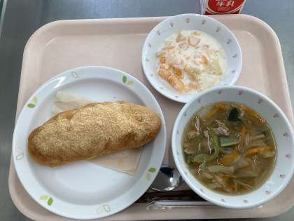 あげパン(きな粉) 春雨スープ フルーツのヨーグルトかけ 牛乳