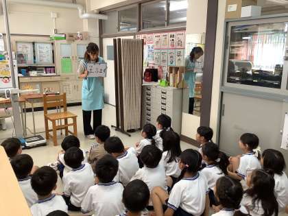 測定の前に、養護教諭から「足」の話を聞きました。土踏まずの名前や場所、役割などを知り、自分の足の裏をよく見て確認していました。