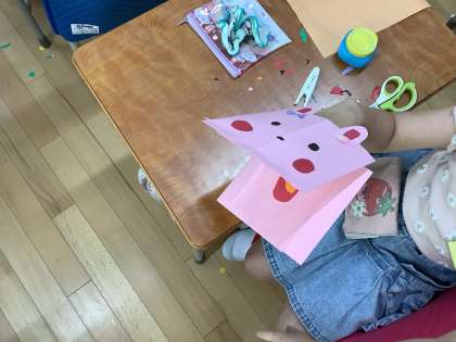 『あそぼうよパクパクさん』では、色画用紙を折り、パクパクさせるところを工夫して取り組みました。何の動物にするか決め、歯や耳の形などをよく考えて完成させました。