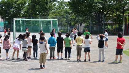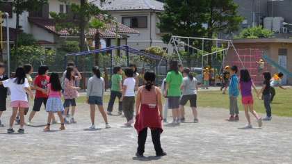 7日中休み、4年生がクラス全員そろって遊んでいました。みんなで相談して遊びを考えたのだそうです。普段、男子は全員でサッカーをしているのですが、この日は女子と一緒に楽しそうでした。