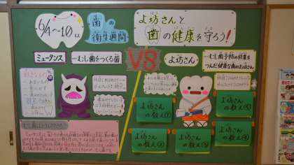 6月4日から10日は歯の衛生週間。月曜日には朝会で保健委員の子どもたちが全校に呼びかけましたが、保健室前にも掲示してあります。養護教諭が知恵を絞って、意匠を工夫して考えました。明日から学校公開週間。保健室前の掲示にもご注目ください。