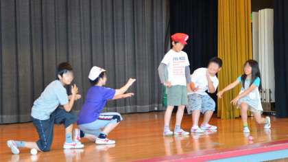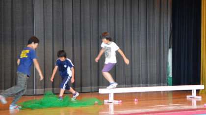 5年1組は、2階学習室で「Go-Goマリオ」、体育館で「The サスケ」。