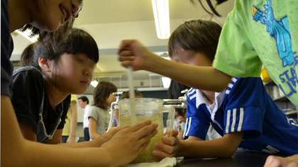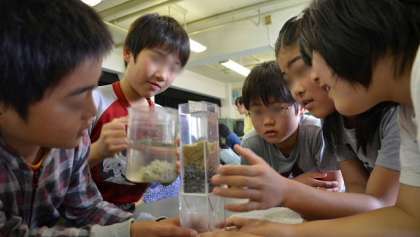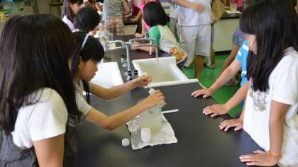 後半は、浄水場で行っている水処理の一部を、実験しました。汚れた水を凝集剤で沈殿させ、砂でろ過する過程を理科室で再現し、子どもたちは興味津々。実験の結果に「わーっ」という驚きの声がわきおこりました。実験のルールをしっかり守って、楽しく実験できました。