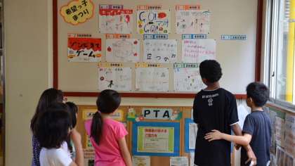 玄関横の階段ホールの掲示板に貼られた、明日の「希望っ子まつり」のポスターを見ている子どもたちです。「明日はどこに行こうかな?」楽しみですね。