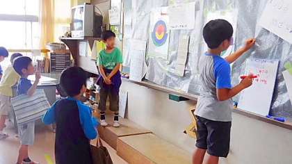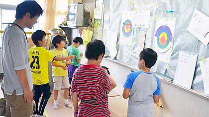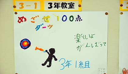 3年「めざせ100点ダーツ」磁石でダーツを作りました。