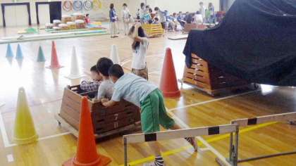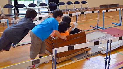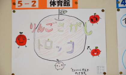 5年2組「りんごさがしトロッコ」 5年生が動かすトロッコでコース上に落ちているリンゴを探します。