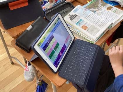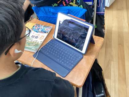 6年生の社会の学習では、学習計画を考え、調べ学習に入りました。今回は教科書や資料集の他に、動画を見て情報収集をしています。その後ロイロノートに考えたことや学習の振り返りを書いています。振り返りを読むと、次の調べ学習に向けて友達と交流することの大切さに気付いたことや次はもっと詳しく調べたいといった内容が書かれていました。