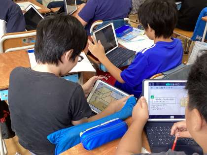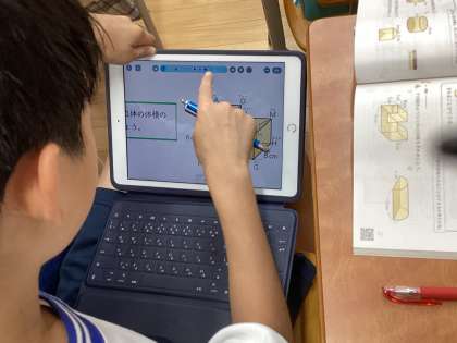この日の学習では、角柱と円柱の公式が分かったので、複雑な形の場合はどのように求めたら良いのか考えました。ロイロノートを使って求め方を考え、友達と考え方を共有しました。複雑な形でも角柱とみれば公式を使って求めることができると分かりました。