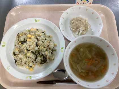 青菜のチャーハン ジャンボしゅうまい 白菜の中華スープ 牛乳