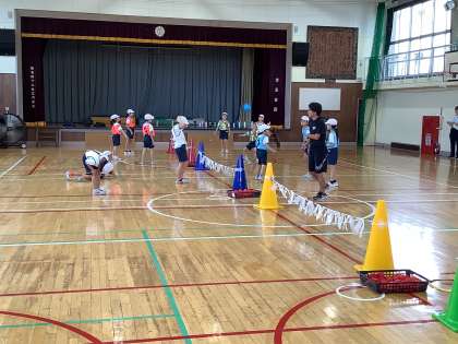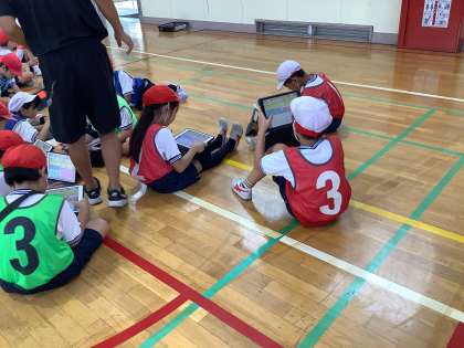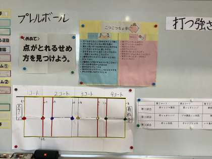 今日は「点が取れる攻め方を見付けること」をめあてに、試合を通して点を取るこつを考え、みんなで話し合いました。話し合う内に2人目の動きが重要であることを気付きました。学級での大会に向けて、意欲が高まりました。