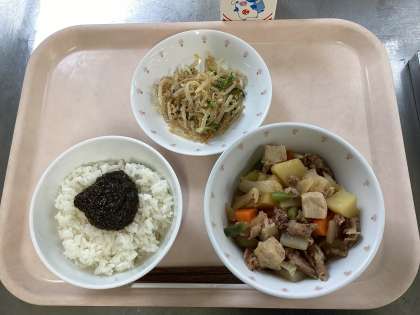 ごはん 海苔の佃煮 肉じゃがうま煮 ごま酢かけ 牛乳