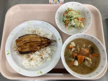 献立 いわしのかば焼き丼 野菜の甘酢 野菜たっぷりみそ汁 牛乳
