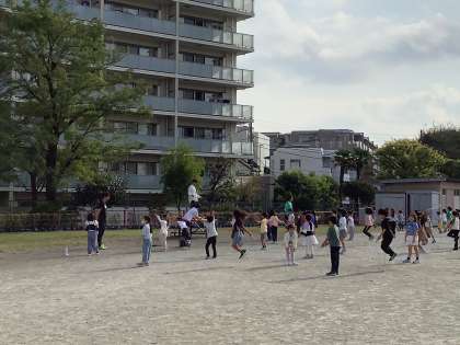 今日は1・2年生が短縄跳びをしました。校庭では2年生がいろいろな跳び方に挑戦したり、音楽に合わせて跳んだりして体を動かしていました。