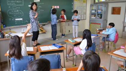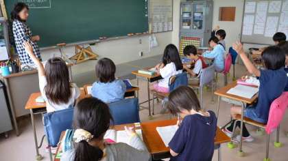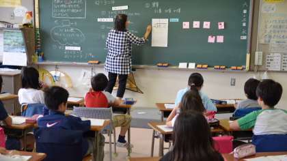 こちらの写真は、算数学習室のようすです。算数少人数指導担当教諭が指導しました。こちらは42÷3を例として学習しました。授業の進め方はほぼ一緒で、42の数をどうとらえるかから入り、束にして考えると分けやすくなるという筆算の方法に導きました。授業の後、ランチルームで研究協議会を行い、わかりやすく子どもが主体的に考える授業を作るためにはどうすればよいか話し合い、講師の先生の指導を受けました。