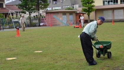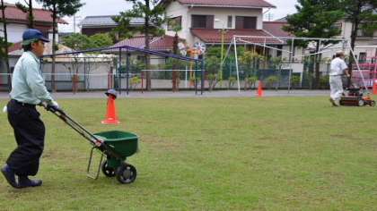 13日、芝生を管理している業者が、芝生の養生整備をしました。「根切り」という作業と「肥料散布」をしました。今が芝の伸びる時期なので大切なのだそうです。ちょっと生育状況が心配です。どうしても日常的に使っているのでしょうがないということですが、青々とした芝生に戻ってくれるとよいのですが。