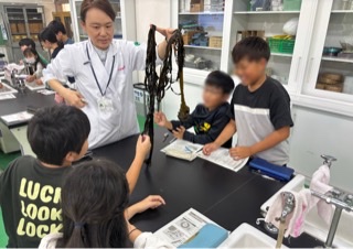 海で育った実物大のわかめや養殖で使う縄を見せていただいたり、わかめの養殖に従事している人の工夫や苦労を教えていただいたりしました。