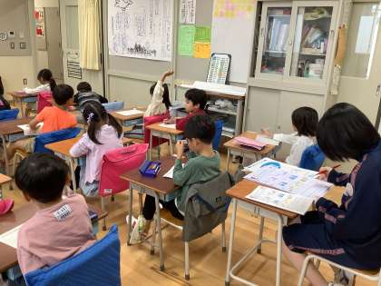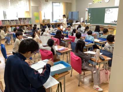 1年生の教室に入って、担任の補助をして丸付けをしたり、休み時間には子どもたちと遊んだりしています。「とてもかわいい」と話し、しっかり1年生の面倒を見ていました。頼りになる先輩たちです。