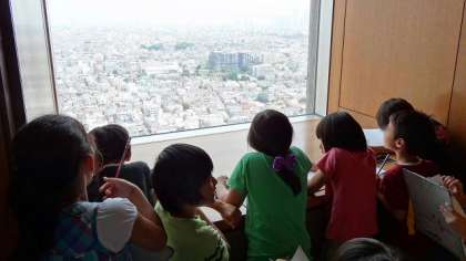 15日(金)、3年生が社会科見学に出かけました。3年生の社会で学習する内容は主に世田谷区の地勢や交通、歴史、産業などです。そこで区内を巡り、地図で学習したことを確かめたり、これから学習する場所を実際に見たりしました。朝、開校記念集会終了後、校庭に集まり貸し切りバスで移動し、最初の目的地「キャロットタワー」の展望室から世田谷全体を見渡しました。