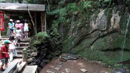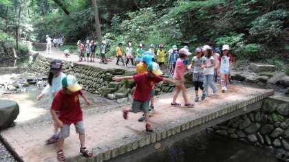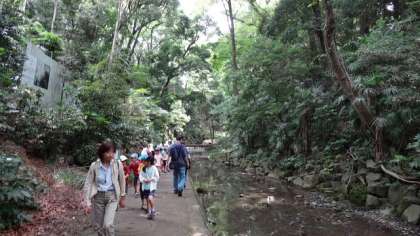 次にむかったのは等々力渓谷。多摩川に注ぐ矢沢川が形作った渓谷です。緑がうっそうとして、環状八号線の近くであることを忘れさせる空間です。子どもたちも、深く削られた谷と頭上に覆い被さる緑に、自然の力を感じとったようすでした。