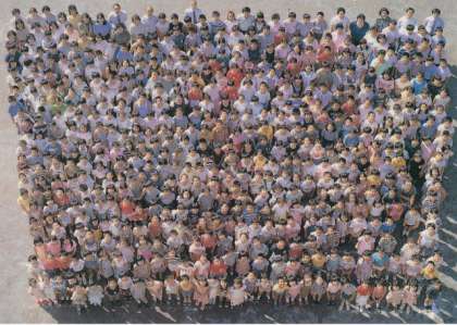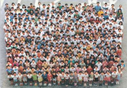 希望ヶ丘団地への入居が進んだために、児童数は一気に増加。昭和56年には842名になりましたが、その後は少しずつ減少していきました。中段の写真は24年前の全校児童で510名、下が19年前で377名です。それでも今よりずいぶん多く感じますね。