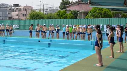 21日1・2校時、曇り空に時折日が差す天候の中、3・4年生がプール開きを行いました。クラスの代表が今シーズンの目標をしっかりと述べ、決意を新たに夏の水泳指導がスタートしました。セレモニーの後、久しぶりの学校のプールの感触を楽しみながら、ルールや練習のしかたを確認して、元気に練習をしました。(ごめんなさい 練習風景の写真は撮れませんでした。)