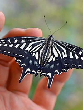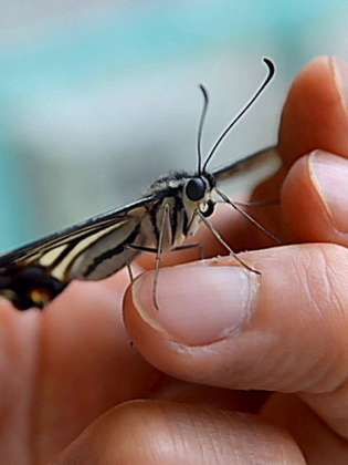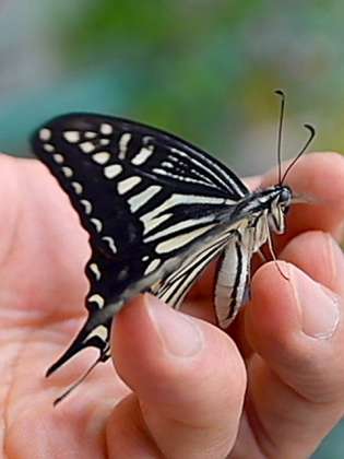 校長室で飼育していたアゲハの幼虫がサナギになり、ついに羽化しました。残念ながら羽化するところは撮影できませんでしたが、外にはなそうとしたところ、指にとまったので写真に撮りました。幼虫の時に、毎日せっせとミカンの葉を採ってきた私を覚えていたのかな?この後元気に飛び立っていきました。