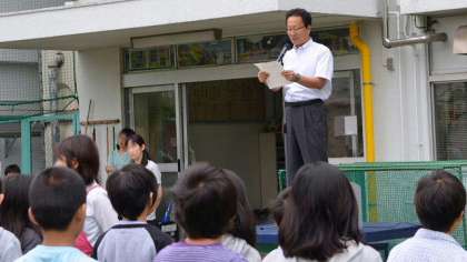 25日(月)の朝会は、曇り空の校庭で行いました。今日は1・2年生が他の学年よりいち早く整列でき、すばらしいと思いました。校長講話では、23日に沖縄県糸満市で行われた沖縄戦全戦没者慰霊祭で、高校三年生の金城さんのスピーチを話題にして、平和の尊さについて話しました。ちょっと難しいかと思ったのですが、子どもたちは静かに真剣に聞いていました。今日は転入生3人の紹介もしました。1年生2人と5年生1人です。いずれも海外からの転入生です。よろしくお願いします。