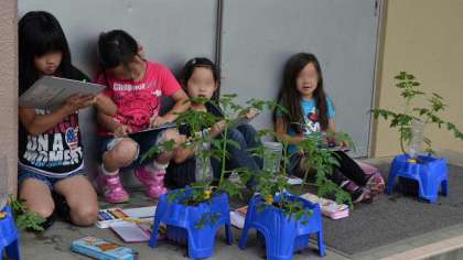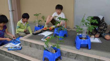 2年生は生活科の学習でミニトマトを育てています。25日今日は、校庭でその観察カードを描いていました。台風の強風にも耐えて、ずいぶん育ちました。観察する子どもたちもうれしそうです。かなり伸びたので、支柱をつけることにしました。