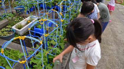 1年生の子どもたちがアサガオに水やりしながら大喜び。花が咲き始めたのです。よく見ると今朝咲かなかった鉢にも花芽が・・・咲くのが楽しみです。