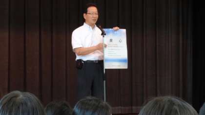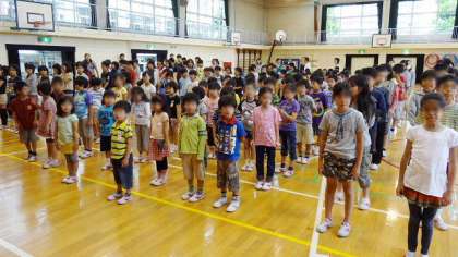 7月2日(月)、雨上がりの朝、このまま校庭で朝会ができるかと思っていたところ、ポツポツと小雨が・・・急遽体育館で朝会を行うことにしました。4年生は社会科見学で8時30分バスが出発ということで玄関に待機で、4年生抜きの朝会となりました。校長講話は「人格の完成を目指して」7月のテーマ「良心」について話しました。みんなよい心をもっていて、いつもはそれに従って生活しているけれども、時々顔を出してしまう「悪の心」をどうおさえるかが肝心だという話を、例をあげて話しました。その後、学校図書館担当の教諭から、図書館の新刊本が紛失することがあり、それも「良心」につながるという話をしました。家庭でもこのテーマについて話してみてください。お願いします。