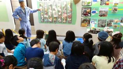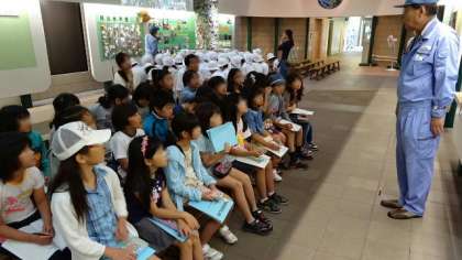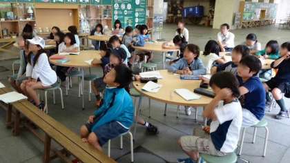 始めに東京都のゴミの処分のしかたや、処分場の状況、日常生活とゴミの関係などについて図や映像でわかりやすく説明していただきました。担当の方が、先日4年生が見学した千歳清掃工場に勤務されていたと言うことを聞いて、子どもたちもなんとなく身近な人からお話を聞いているようで、とてもよい雰囲気でした。