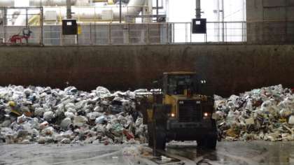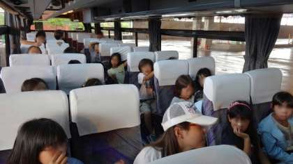 説明の後、バスに乗り込み処分場の施設を車窓から見学しました。粗大ゴミの処分のしかたや、不燃ゴミの量が減っていること、焼却灰や不燃ゴミを埋め立てているところを遠くから見たりして、ゴミの問題について、子どもたちは真剣に考えていました。