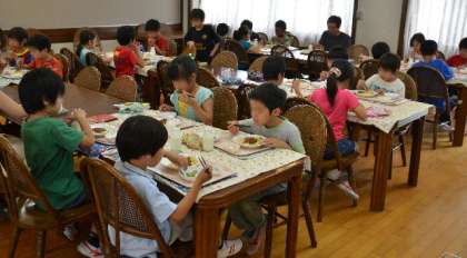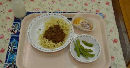 3日の給食に、グリーンカーテンでとれたキュウリを使いました。ジャージャー麺の具です。みんなおいしく食べました。
