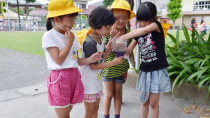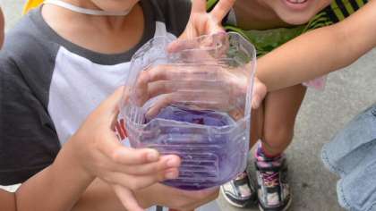 1年生の女の子ががペットボトルに青い水を入れて見せに来ました。「校長先生、すごいでしょう?」「いれ物は主事さんからもらったの!」「中の青い水はどうしたの?」と聞いたところ、「アサガオの花をしぼって作ったの」ということです。「よくできたね、きれいな色だね」と言ったら子どもたちはにっこり。