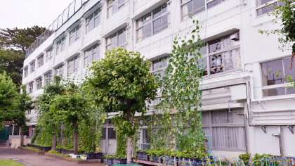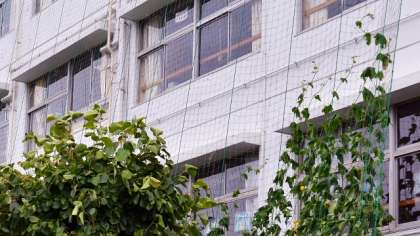 台風で被害を受けたグリーンカーテンですが、その後順調に伸びて、3階に到達しています。葉の数も多くなり、グリーンカーテンとしての役割も果たすようになってきています。写真は、12日、強風に揺れているようすです。