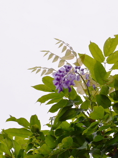 校長室前にフジ棚があり、今の時期はどんどん葉が生い茂り、緑が濃くなっています。ところがなんとフジの花発見。新しいツルの先に花がさいています。季節を勘違いしたのでしょうか?