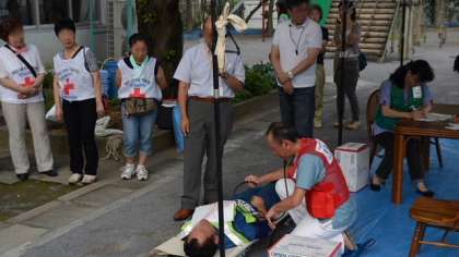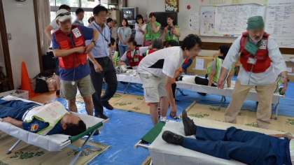 14日(土)、希望丘小学校避難所運営委員会主催の「避難所宿泊体験訓練」が行われました。午後3時30分に運営スタッフが集合して打ち合わせを行い、避難所開設準備を行いました。その後4時から区内でも初となる「医療救護所」の運営訓練が行われました。本校は避難所とともに地域の「医療救護所」にも指定されており、震災発生時には近隣で負傷した方などが運び込まれます。ランチルーム前の仮設テントでトリアージ(症状の程度によって選別する)を行い、重傷者は医療救護所となるランチルームで応急処置を行います。実践的で真剣な訓練が行われました。