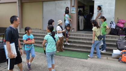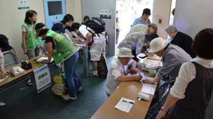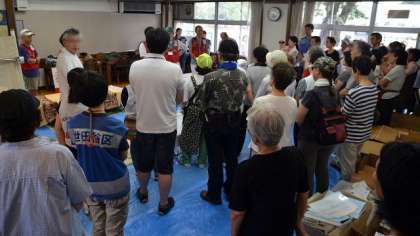 避難所運営スタッフや他地区訪れた方も、医療救護所訓練を見学しました。実施してみて初めてわかる課題も見つかり、解決できることはすぐに解決にむけて動き出すことにしました。5時に避難所宿泊体験訓練の受付が始まりました。地域、本校児童保護者、他地区からの体験希望者が次々と訪れ、受付担当がてきぱきと指示する中受付をすませます。