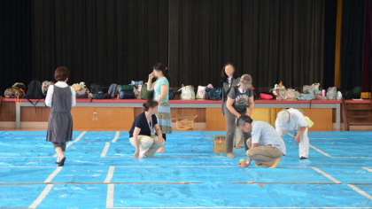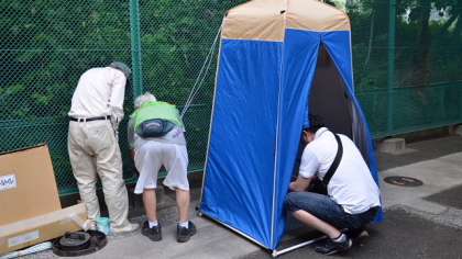 受付を済ませた後は、いよいよ避難所の設営が始まります。本校の特色はブルーシートを体育館フロア全面にしくことです。シートには通路の表示と避難スペースの区切りがわかりやすく表示されています。設営で大事なのはトイレ。体育館北側に設置されているマンホールトイレの設置方法や使い方についての説明を受けました。